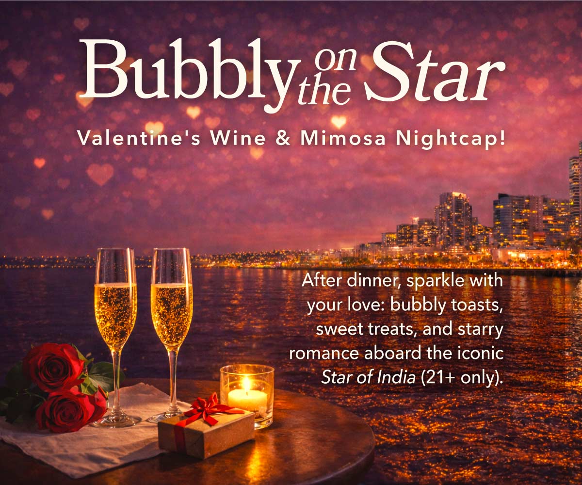 Step aboard the world’s oldest active sailing ship for a Valentine’s night like no other. Bubbly on the Star is a relaxed 1.5-hour evening escape—no formal dinner, just pure romance on the waterfront. Designed as the perfect after-dinner nightcap, couples can unwind with sparkling drinks, decadent sweets, and live acoustic music while surrounded by the glow of San Diego Bay.